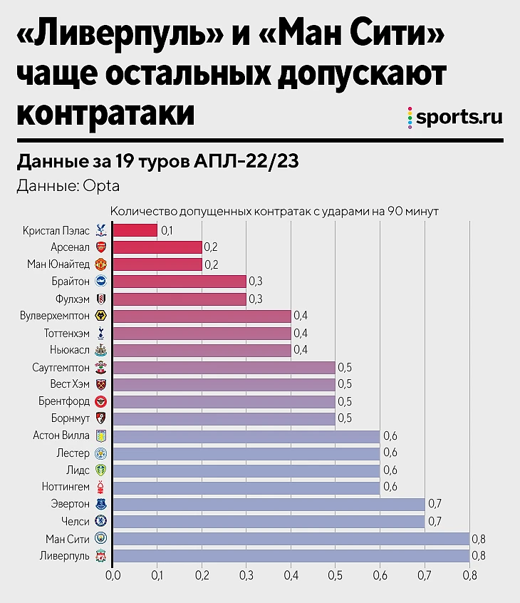 Все очевидно: никто в АПЛ не допускает контратаки чаще «Ливерпуля» (столько же «Ман Сити»). Правда, необходимо учитывать ограничения данных. В выборку попадают не все контратаки, а только те, которые завершились ударами, отсюда и столь малые значения у каждой команды.