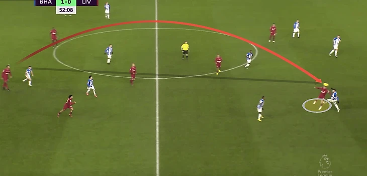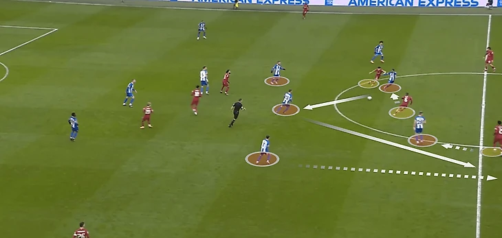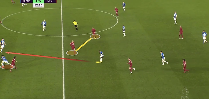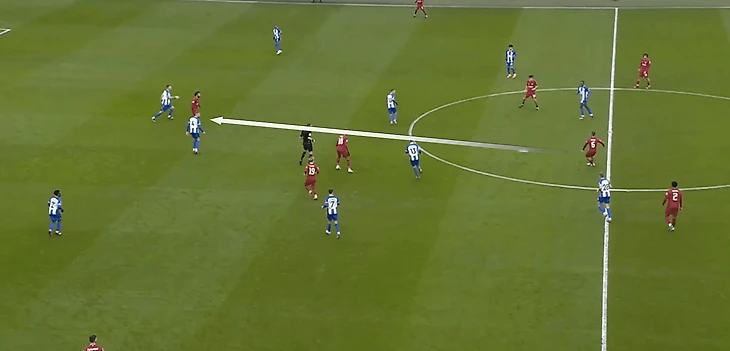 Мяч отскакивает в центральный круг, где два игрока «Ливерпуля» не успевают накрыть соперника. Тот отыгрывается вглубь, и у «Брайтона» несколько вариантов для продолжения контратаки, самый опасный – фланговый (его в итоге и выбирают). И это уже близко к катастрофе. Атакующая тройка «Ливерпуля», кажется, не стремится накрывать тройку «Брайтона» в центре. Два игрока в красном продолжают движение к чужим воротам.