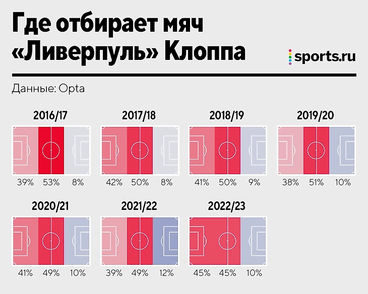 Раньше большинство возвратов мяча приходилось на центр поля, сейчас процент там рекордно низкий. А доля отборов на своей трети рекордно высокая. Получается, главная суперсила Клоппа (высокий отбор) испарилась и причина где-то в центре поля?