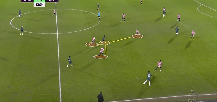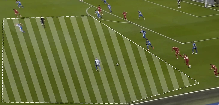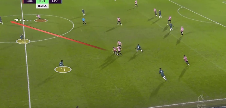 Он ее и получает. Тиаго и Фабиньо вроде бы перекрывают центр, но не угрозу. Эван Фергюсон пользуется тем, что Митома (выделен красным) уводит Трента, перед «Брайтоном» открывается простор…