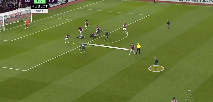 Похожая история в матче с «Астон Виллой». Проигранное единоборство в чужой штрафной – и у соперника снова есть хороший вариант выхода в атаку. Фабиньо (подсвечен желтым) не выдергивается на Макгинна.