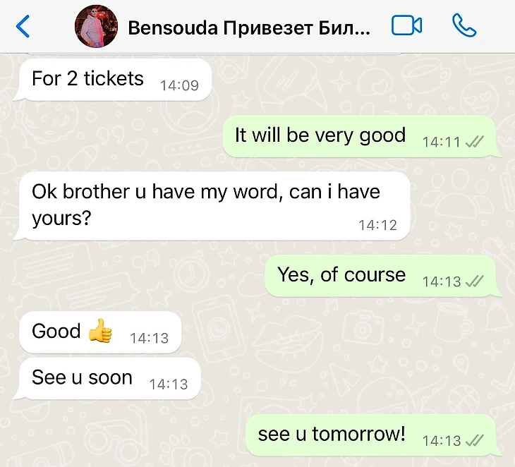 Тот спекулянт, который все-таки продал нам билеты, сразил одним своим сообщением. Он дал свое слово, что все будет в порядке и запросил у меня мое.