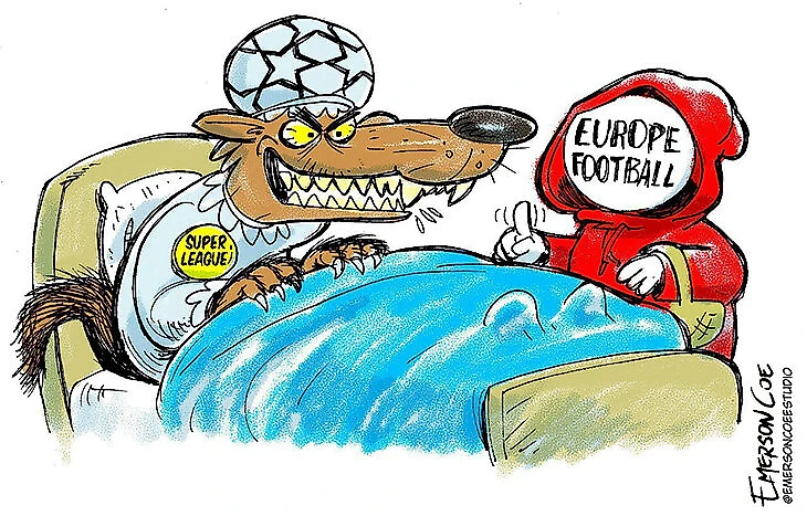 Президент Ла Лиги Хавьер Тебас – главный противник Суперлиги. Он тут же выступил в соцсетях – опубликовал карикатуру Эмерсона Коэ по мотивам сказки Шарля Перро «Красная Шапочка», на которой Суперлига изображена в роли волка в бабушкином чепчике, а европейский футбол – в роли Красной Шапочки.