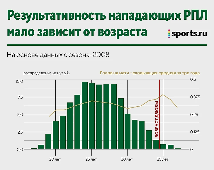 2. Возраст не влияет ни на результативность, ни на игровое время. Если ориентироваться на примеры прошлого, Дзюба вполне может забивать и получать минуты, как в пиковые сезоны в «Зените».