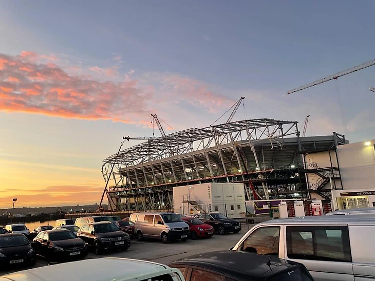 Чем ближе вы подъезжаете к доку Брэмли-Мур, тем более впечатляющим выглядит здание. Все четыре трибуны обретают форму, как и крыша, и внутренние работы все еще продолжаются. На стройплощадку нет общественного доступа, но с этой стороны забора, наблюдая, как башенные краны опускают на место один бетонный блок за другим, он начинает выглядеть как стадион вместимостью 52 888 человек, которым он и станет. Давно заявленная цель переезда с «Гудисон Парк» к началу сезона 2024/25, в августе следующего года, кажется правдоподобной.