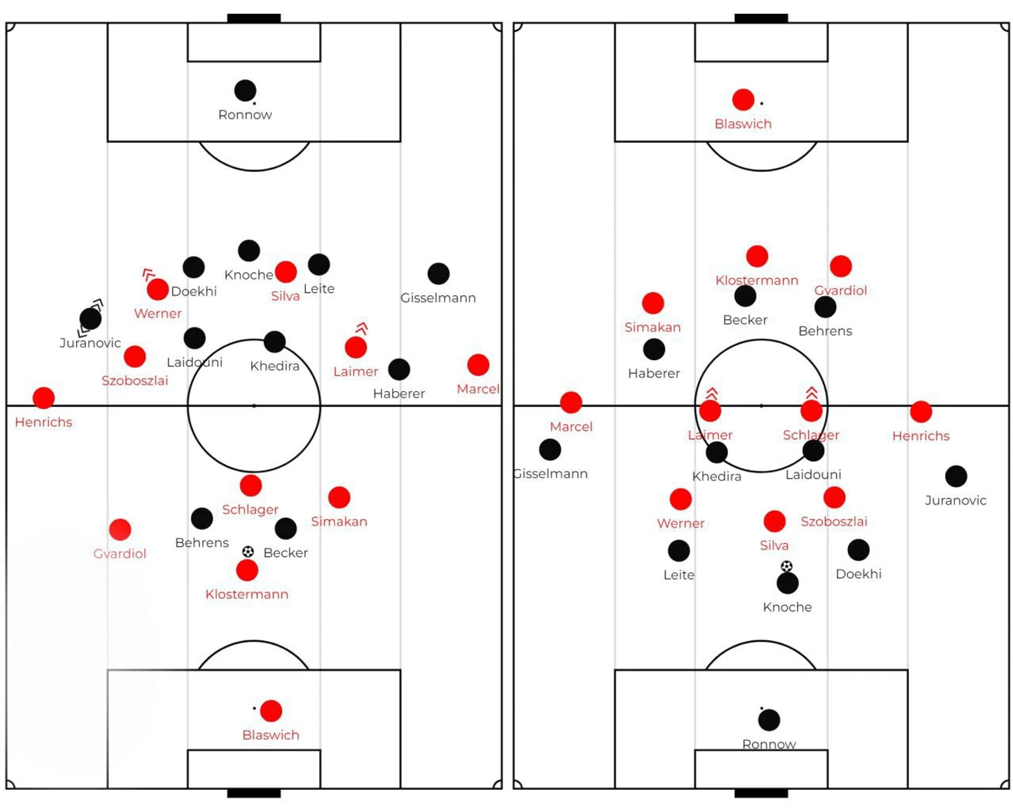 Без мяча (правое поле) верхняя прессингующая тройка «РБ» полностью перекрывала центр, а опорники Шлагер и Лаймер часто успевали на подборы после дуэлей Хаберера или Беренса. Вингбэки «Униона» постоянно находились под опекой оппонентов, однако справа Юранович и Лаидуни иногда продвигали мяч на взаимодействии через передачи. Довольно редкое явление берлинцев, когда на фланге удаётся продвинуть мяч через 5/6 коротких/средних передач. В целом отличный перфоманс подопечных Марко Розе, результатом обороны стал всего один нанесённый удар «Униона» за тайм.