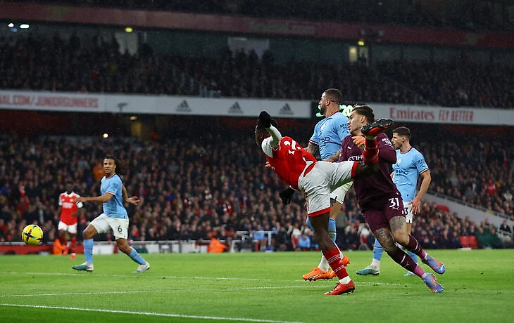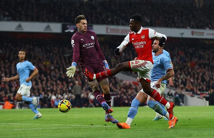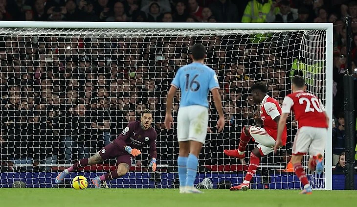 У форварда «Арсенала» был еще и контакт с вратарем «Сити» Эдерсоном в штрафной: причем уже после удара по воротам.