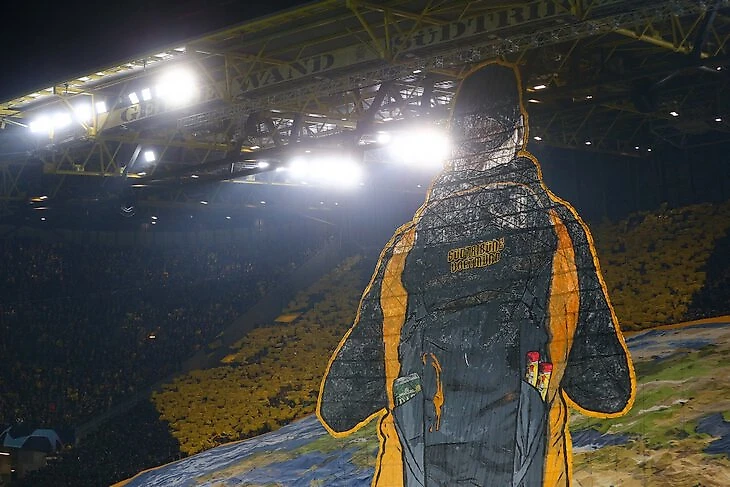 9 апреля 2013-го. «Сигнал Идуна Парк», 1/4 финала финала Лиги чемпионов. Гигантский баннер с джокером, который через бинокль наблюдает за полем – туда выходят игроки «Боруссии» и «Малаги». Под персонажем – отсылка к 1997-у и последнему для «Боруссии» Кубку чемпионов – «По следам трофея, который мы потеряли». Телетрансляция позволяет оценить масштаб полотна – он явно высотой в девятиэтажку. Игроки тоже замечают перфоманс – они поворачивают головы влево, показывают друг другу и глазеют на баннер.
