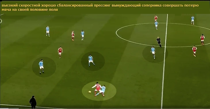 Создаётся впечатление, что Сити готов специально отдать мяч «Арсеналу», чтобы потом задавить его мощью своего прессинга тем самым заставить владеющих мячом совершить потерю на своей половине поля или в лучшем случае выбить мяч в аут или без адресно выносить мяч на чужую половину поля.
