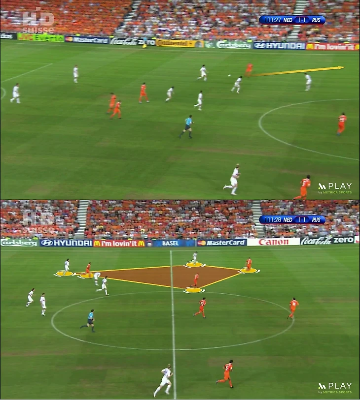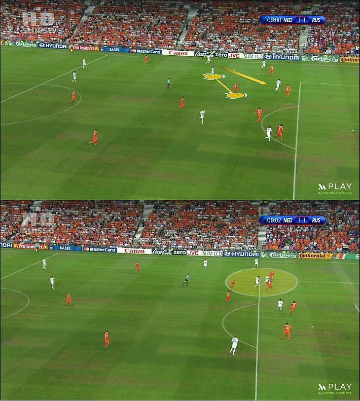 Победный гол Нидерландам – коллективный отбор. Изначально Жирков встречал Ван Перси, но Робин сместился в середину, где россияне численно превосходили атакующую группу. Билялетдинов, Семак и Торбинский отработали по Ван Нистелрою, а Жирков шведой в касание отрезал Хейтингу – так Аршавин остался 1-в-1 с Ойером.