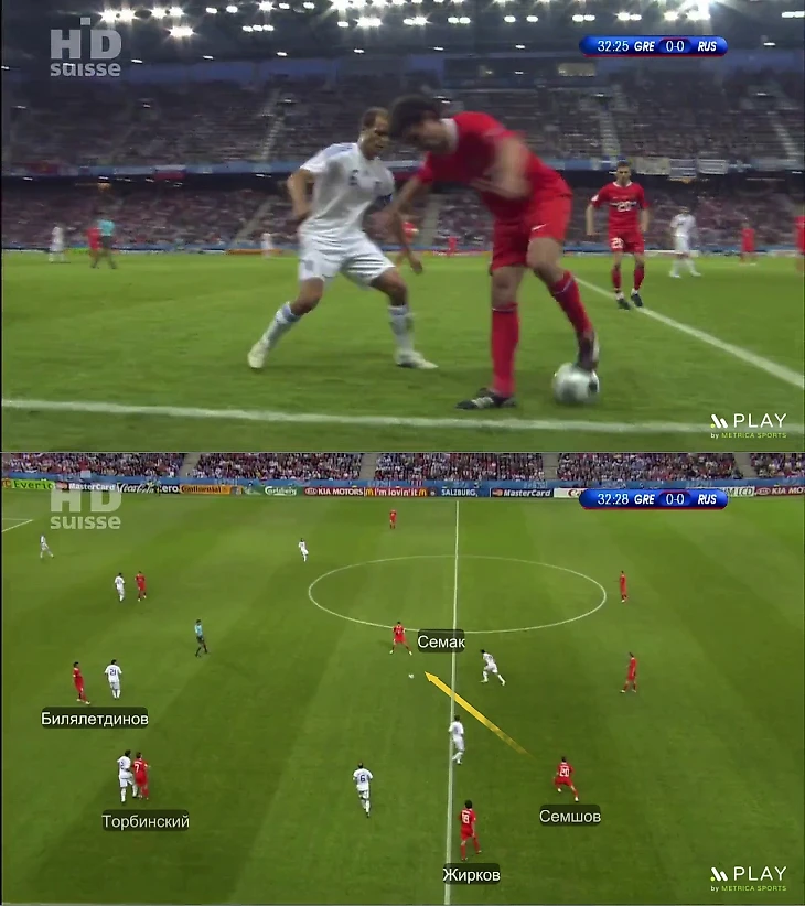 Даже спустя 15 лет поражает, как Жирков прекрасно разбирался на ограниченном пространстве. У него очень тонкая и легкая обработка мяча, поэтому он даже в окружении соперников находил выход: пробрасывал черпачком, легко ускорялся и находил партнеров по разным направлениям. В этом эпизоде против Греции (1:0) Жирков на шаге проскочил дальше и, не сближаясь, нашел коридор для передачи на Павлюченко (4:40).