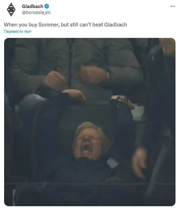 «Когда ты купил Зоммера, но все еще не можешь обыграть Гладбах». Генеральный директор «Баварии» Оливер Кан явно недоволен результатом.
