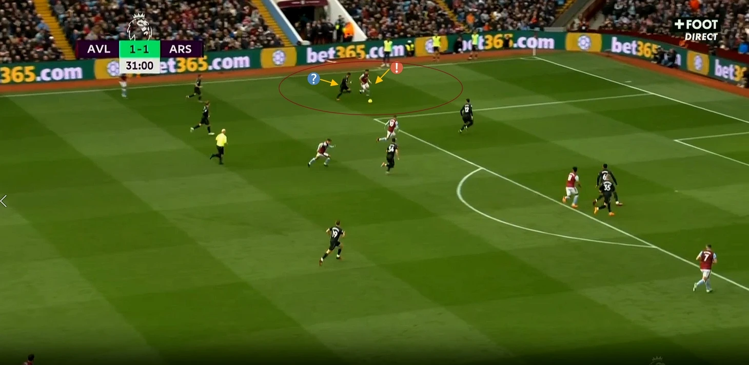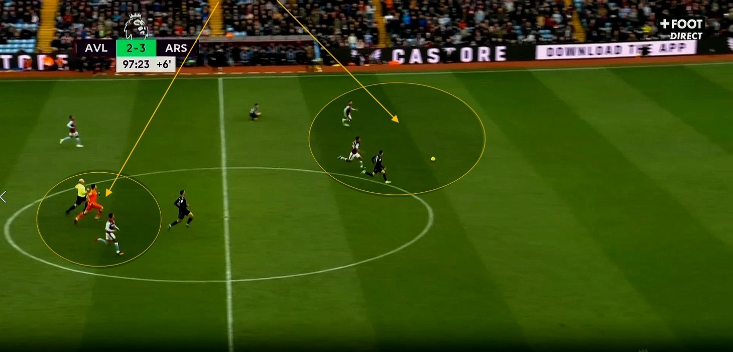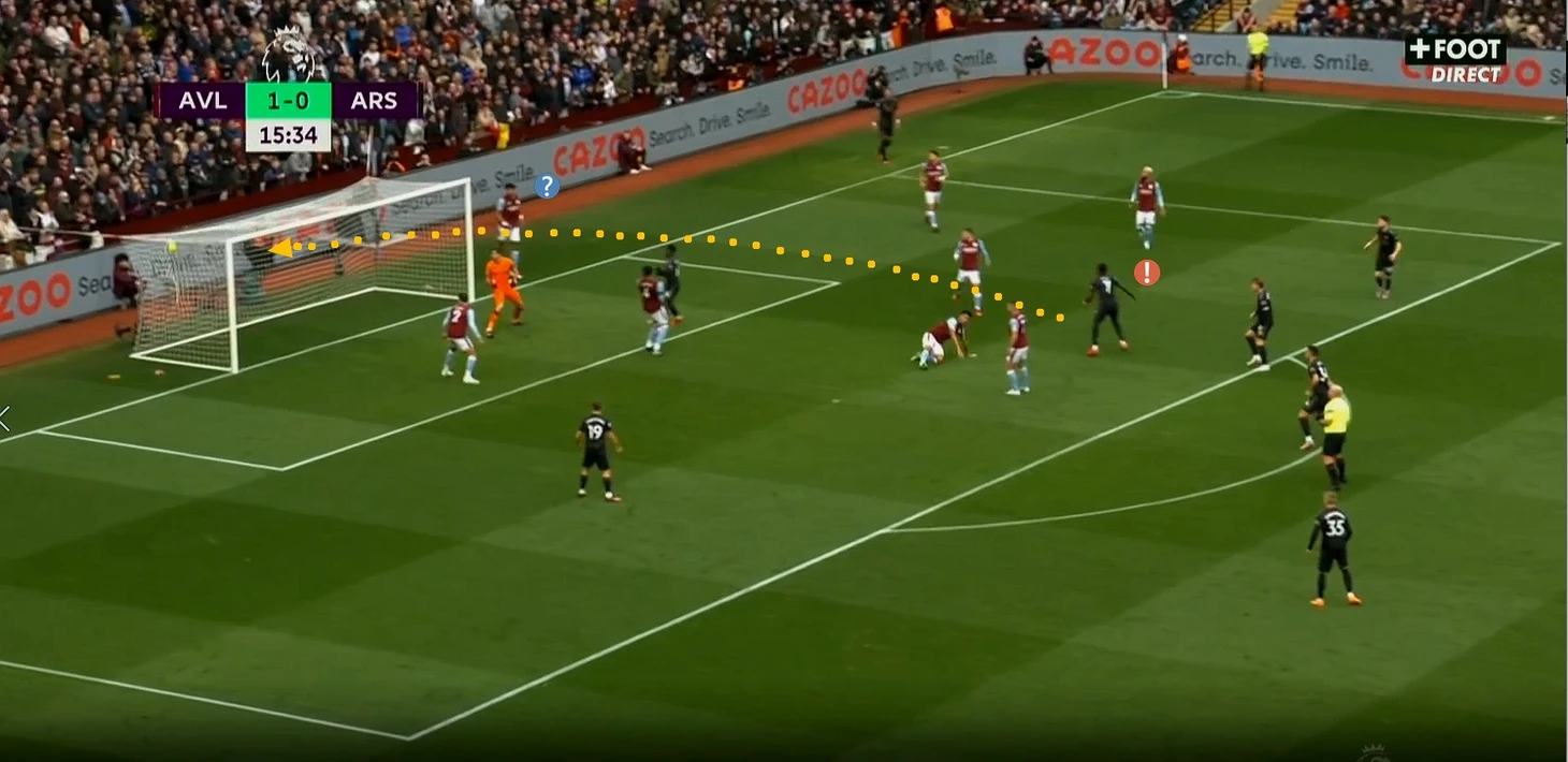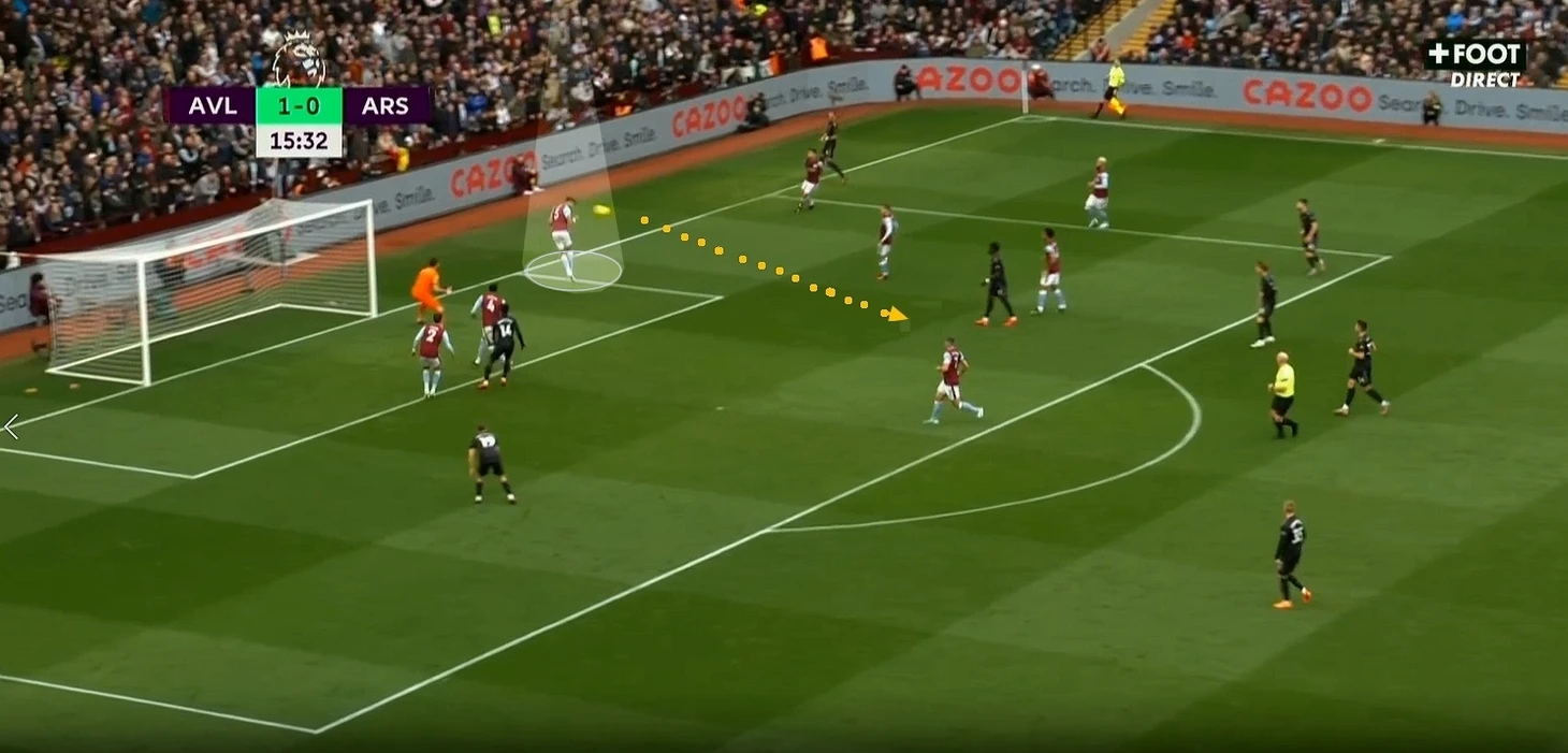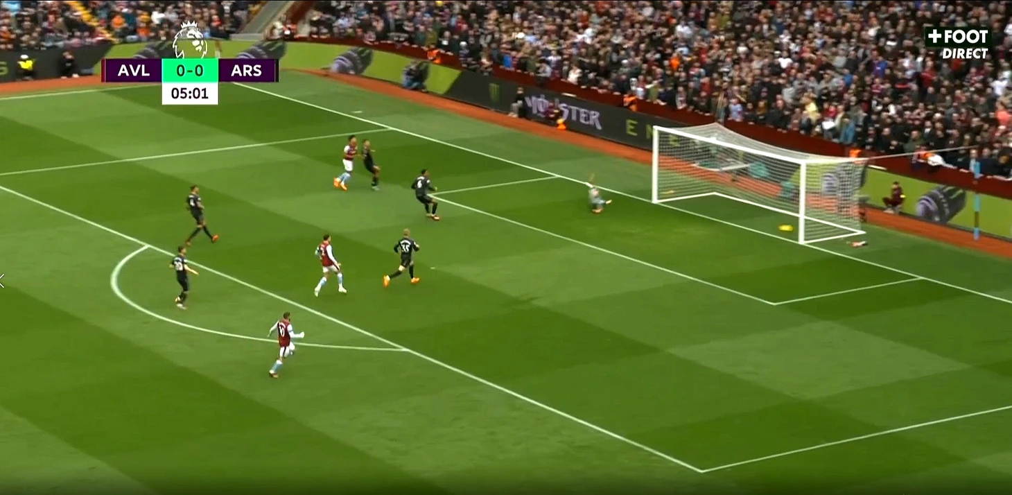 Зинченко теряет мяч на чужой половине поля, затем пытается придержать соперника рукой, но тот убегает от него, отдает пас на Уоткинса,
