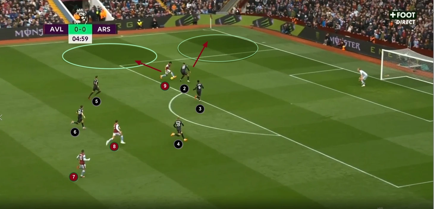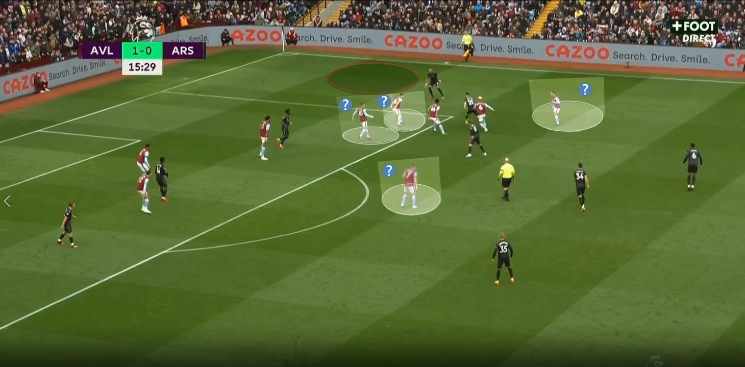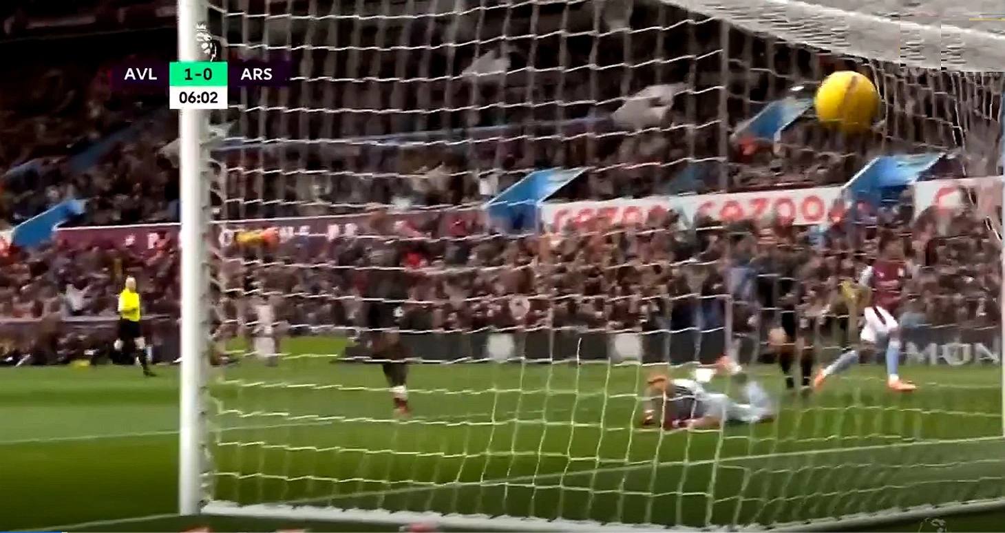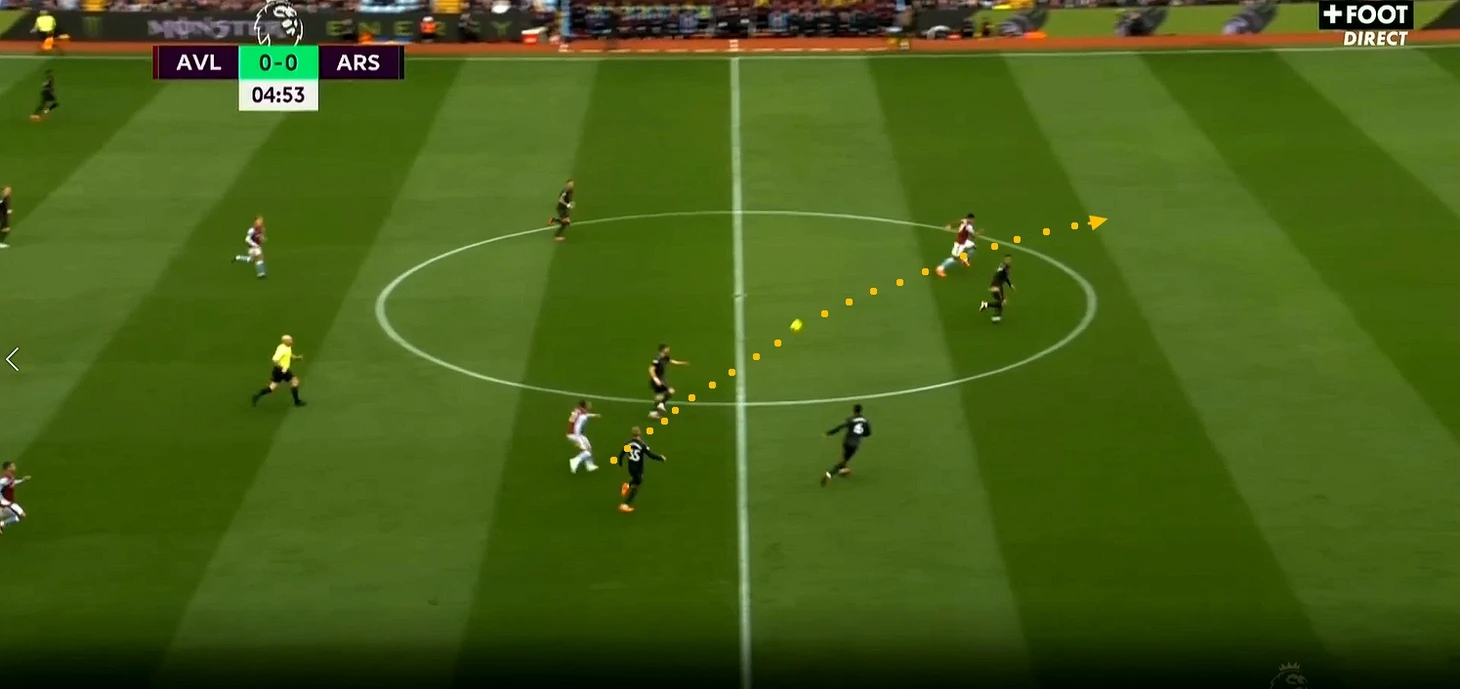 Зинченко теряет мяч на чужой половине поля, затем пытается придержать соперника рукой, но тот убегает от него, отдает пас на Уоткинса,