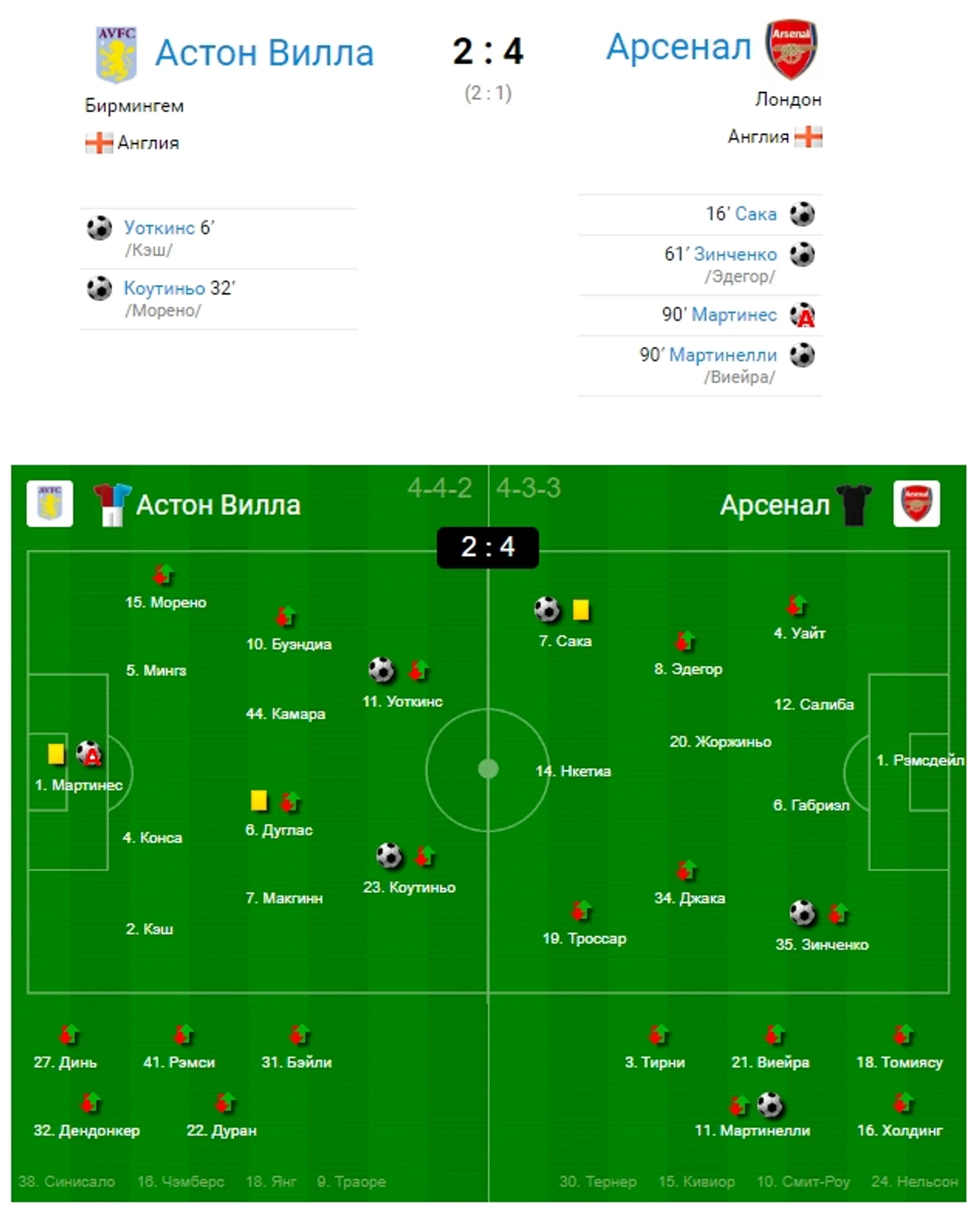 31:09 Гол:Коутиньо Филиппе (Астон Вилла) бьёт правой ногой из штрафной в створ ворот. Ассистент Морено Александре (Астон Вилла). Счёт 2:1.ГООООООООООЛ! Морено с левого фланга атаки простреливает в штрафную, Джака не может прервать передачу, а Коутинью наносит точный удар, выводя свою команду вперед в счете!
