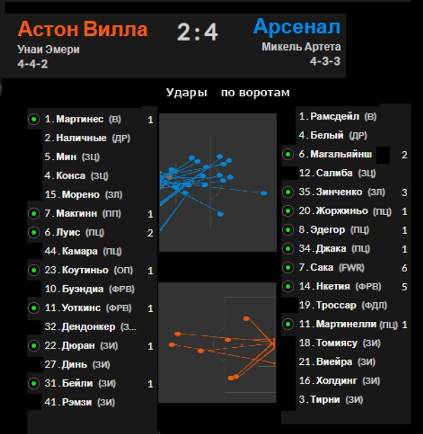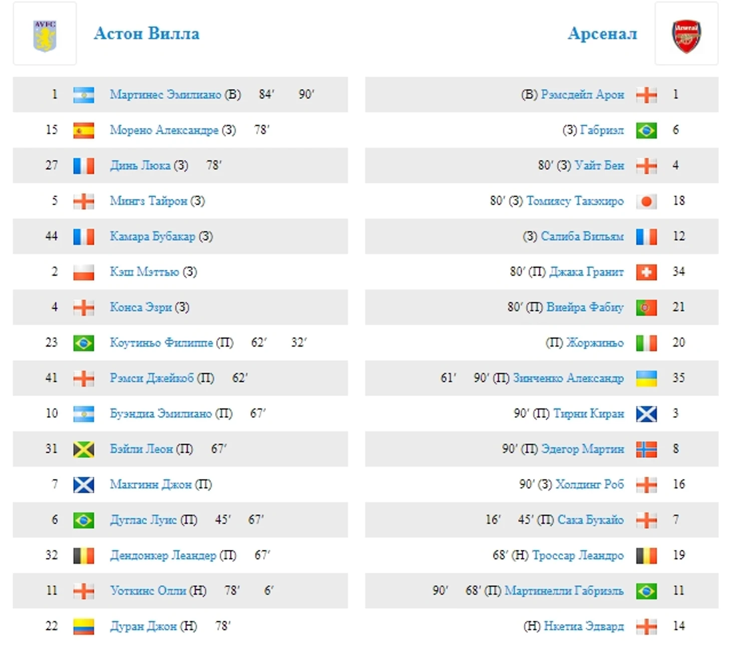 83:56.Наказание:Мартинес Эмилиано (Астон Вилла) получает жёлтую карточку (затягивание возобновления игры).Слишком долго Мартинес собирался вводить мяч в игру ударом от ворот.