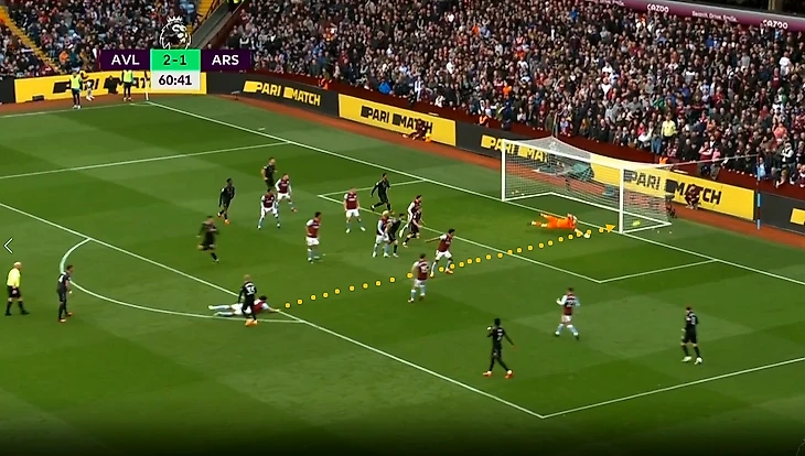 Гол:Уоткинс Олли (Астон Вилла) бьёт левой ногой из штрафной в створ ворот. .