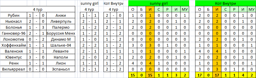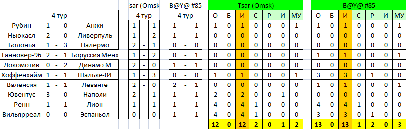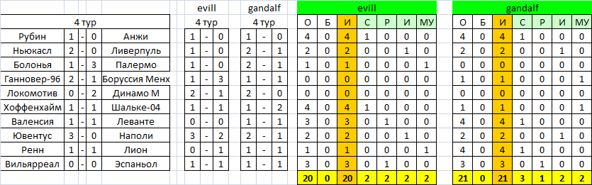 №1: RedWhiteFan, у которого игра совсем разладилась за эти выходные. Мало того, что проиграл оба тура, в воскресенье поставил антирекорд ФП-4, набрав 4 очка благодаря лишь 4-м угаданным мячам. Все бы ничего, даже Fantasts до половины матча его в этом поддерживал, но резкий рывок в виде угаданного счета – и смысла сопротивляться не было никакого. Пожелаем удачи – все равно шансы на ее конечное количество у него есть благодаря двум стартовым победам подряд.