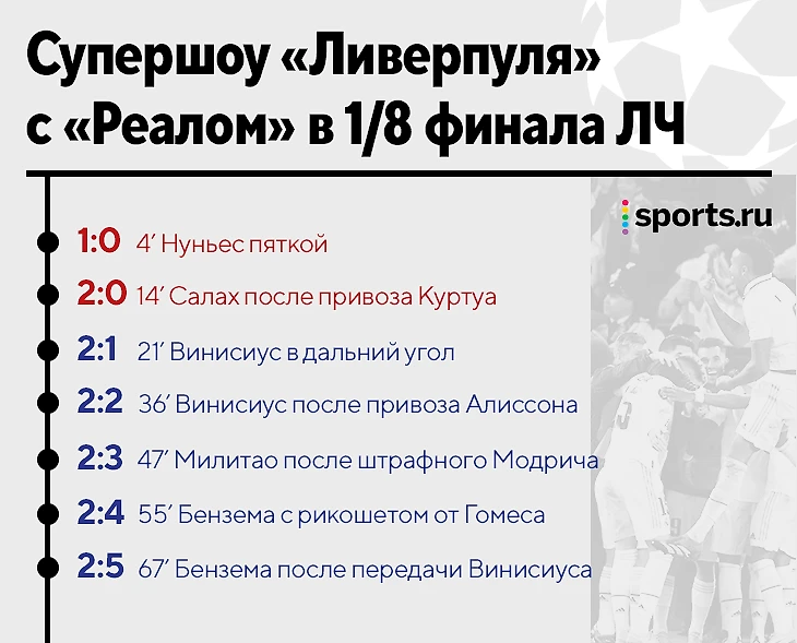 • «Мадрид» – лишь вторые, кто вообще забил столько в одном еврокубковом матче против «Ливерпуля». Раньше удавалось только «Аяксу» в Кубке европейских чемпионов – в декабре 1966-го голландцы выиграли со счетом 5:1.
