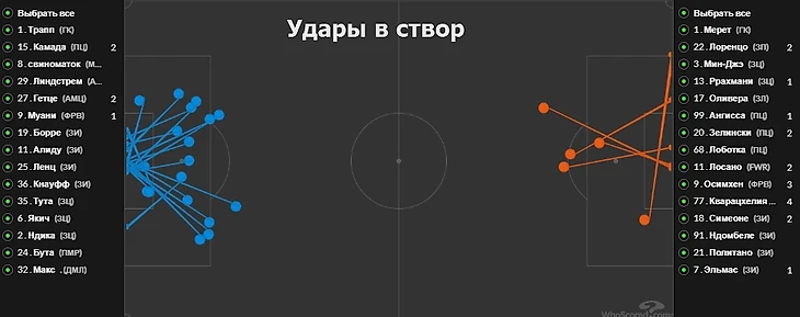 2 Хвича оказался на левом краю чужой штрафной и сумел сделать передачу чуть назад, но угодил в соперника. Тот едва не отдал пас Осимхену, но все же первым на мяче оказался Трапп. 4 Кварацхелия с левого фланга выполнил подачу в центр чужой штрафной, но Трапп удачно сыграл на выходе и без проблем забрал мяч.