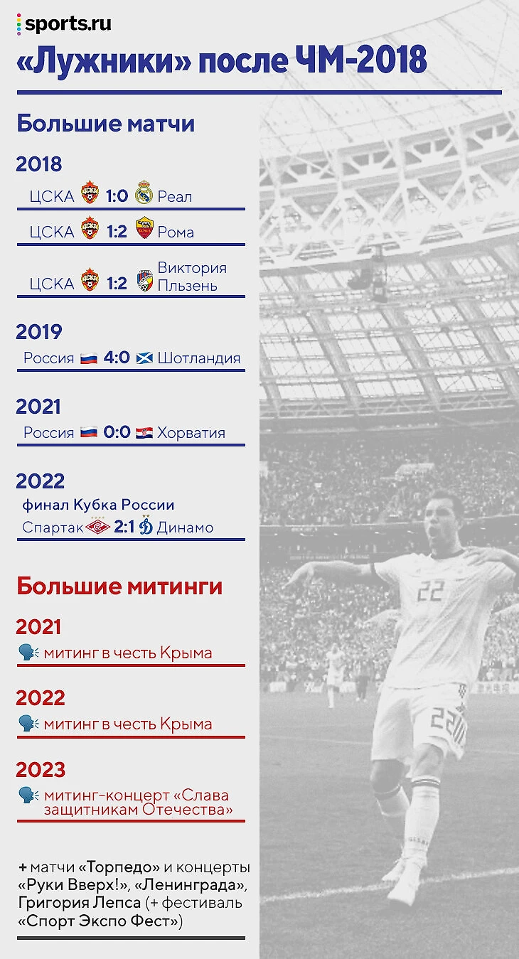 Весной 2022-го мы зафиксировали, чем живет главный стадион России после ЧМ-2018. Помимо февральского митинг-концерта, с того времени «Лужники» увидели лишь одно большое событие – финал Кубка России между «Спартаком» и «Динамо» в конце мая 2022-го.
