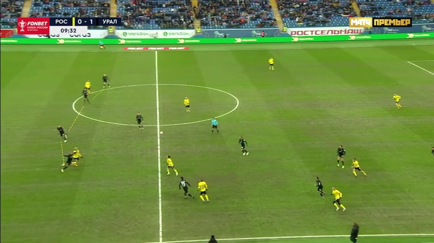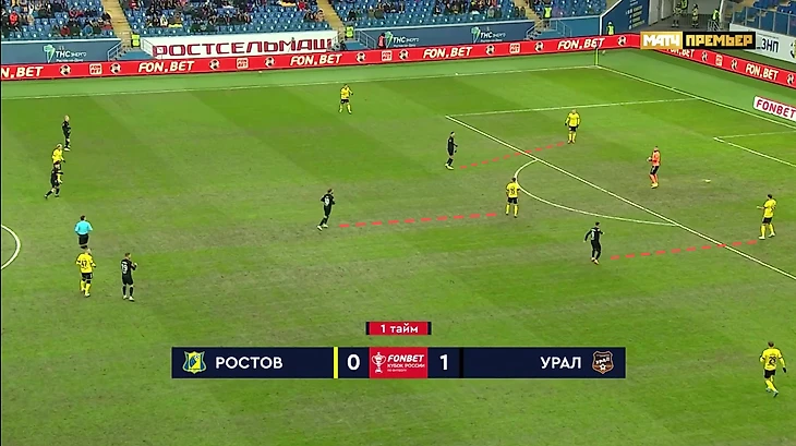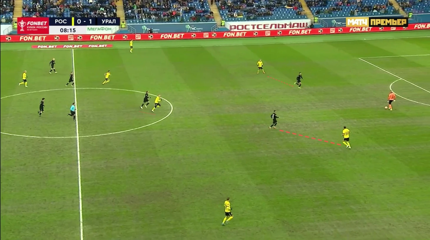 Для игры без позиционных атак "Урал" должен был обеспечить себе достаточное количество возвратов мяча. Гончаренко придумал, как не позволить "Ростову" разыгрывать мяч низом от своих ворот. За счёт ассиметричных флангов удавалось накрывать сразу двух центральных защитников (справа Ранджелович выдвигался на Осипенко и помогал Каштанову), при этом сохраняя трёх игроков в центре поля (Бикфалви оказывался глубже, играя по одному из опорников).