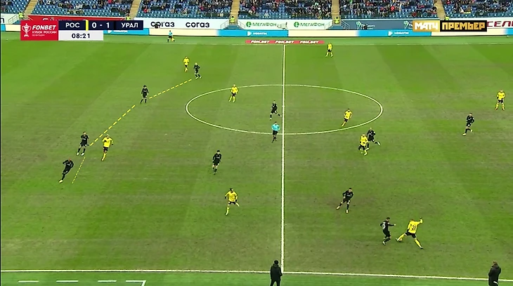 По рисунку игра была очень похожа на осенний матч между этими же командами в РПЛ. “Урал” точно так же не стремился долго контролировать мяч, было очень много длинных передач вперёд на Каштанова, Бикфалви и Ранджеловича. Это логично, в отсутствии лучших игроков по продвижению мяча из глубины (Газинский, Подберёзкин) и учитывая то, что играть приходилось против одной из лучших команд по интенсивности прессинга (9,91 PPDA – 5ое место в этом сезоне РПЛ). В первом тайме у "Урала" неплохо получалось выигрывать борьбу на чужой половине поля. Но Гончаренко решил отказаться от коротких передач даже в финальной трети. Как только удавалось получить мяч без давления, атакующие игроки сразу насыщали штрафную площадь и шла подача.