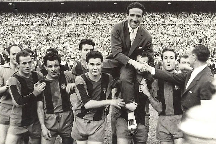 Мне кажется, если вернуться в 1960-е и спросить испанского футбольного болельщика «Что такое Барселона?», то в первую очередь он вспомнит именно про Каталонию и противостояние «Барсы» с «Реалом» как метафору противостояния Каталонии и центра, Мадрида. Про атакующую игру как составляющую «сине-гранатовой идентичности» он даже и не факт, что вспомнит. Не берусь, конечно, судить со стопроцентной уверенностью (уж извините, сам подобное не пробовал). Но откуда же мы вообще можем сделать такие выводы? Ну, например, посмотреть на лучший период в истории «Барселоны» середины века - на конец 50-х - начало 60-х. Командой тогда руководил Эленио Эррера - человек, который вообще-то считается наряду с Нерео Рокко главным популяризатором «катеначчо», уж совсем не каталонского стиля ведения игры. Да, в «Барселоне» он скорее всего ставил еще не самую радикальную вариацию этого стиля, которая потом предстала в «Интере», но самого факта это не отменяет. Эленио Эррера - это человек, который открыто презирал команды, проповедующие владение мячом, ведь «без игрока мяч движется гораздо быстрее». Контраста с современными идеями сильнее придумать сложно. Я не хочу сказать, что в «Барселоне» тогда всегда ставили автобус и играли незрелищно. Я хочу сказать, что тогда, во-первых, еще не существовало такого многообразия атакующих тактик, какое существует сейчас (игра вообще по сути сводилась к тому, что сейчас бы назвали «дворовым футболом» и побеждали в ней зачастую самые быстрые и самые сильные). А во-вторых, именно каталонской фишкой любовь к атакующему стилю тогда еще не стала.