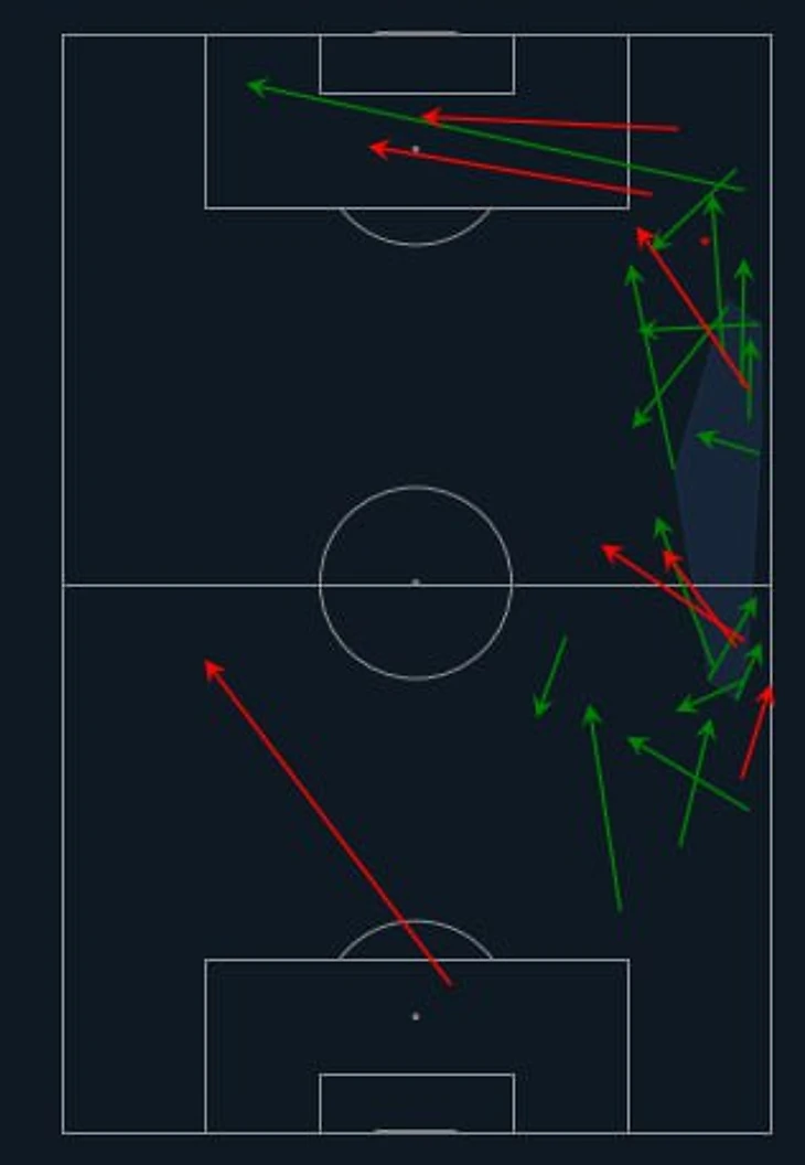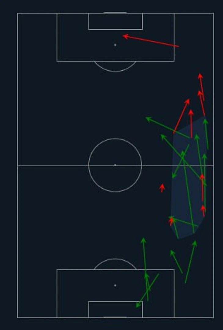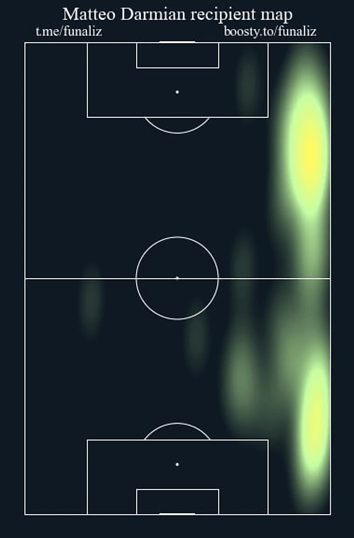 Второй момент — позиции латералей (Дармиана — в особенности). Так как вингеры были заняты опекой крайних ЦЗ, выдвижения на латералей Интера перекладывались на фулбэков Порту. Дармиан и Димарко располагались в пространстве за вингерами, но относительно невысоко — будет видно сгущение на тепловой карте принятых Дармианом передач ниже. Из-за этого увеличивалось расстояние от фулбэков Порту до них, соответственно, точно увеличивалось время для принятия решения после приёма, плюс рискованные высокие позиции Сануси и Мариу давали больше возможностей линейно двигать мяч во фланг им за спину