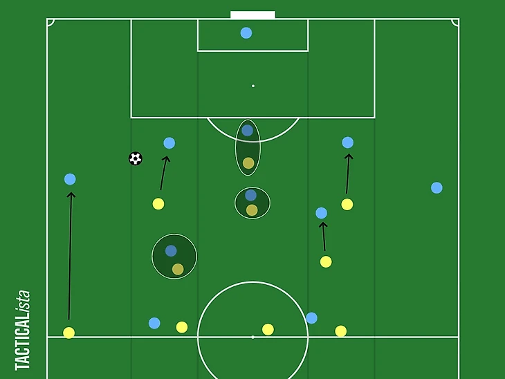 Свободным оказывался Кунде — учитывая его качества на мяче, такой выбор казался странным. В первом тайме он довольно активно продвигал владения на чужую половину через carry и включался в финальной трети