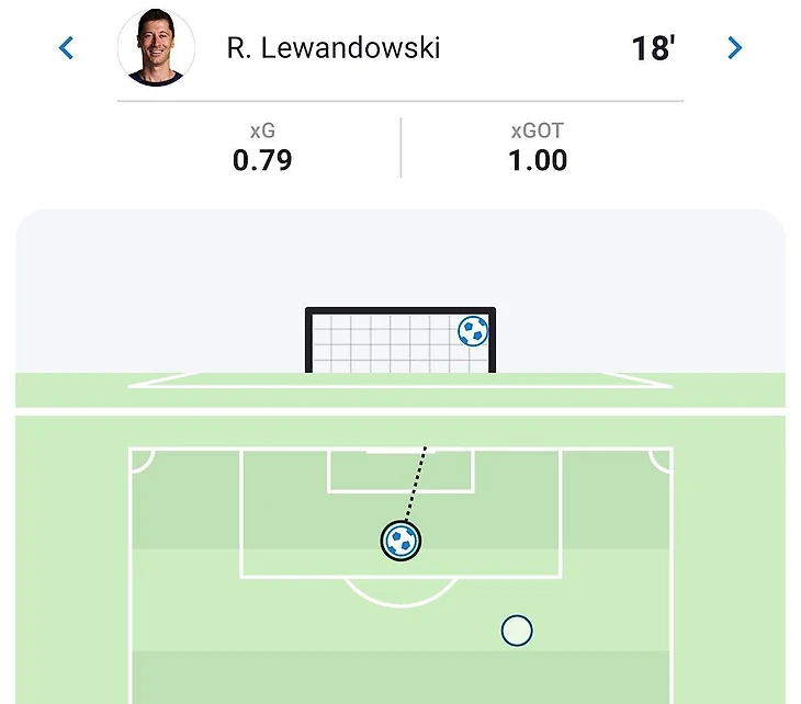 Конечно, этот момент с негативной точки зрения характеризует качество их данных (хотя, справедливости ради, фиксация координат ударов в goalMouth — не самое важное из существующего). Как итог — их пост-шот модель посчитала, что этот удар невозможно отразить, как я понимаю, для этого должно выполнится условие «мяч касается каркаса при влёте в створ». Но проблема в том, что выполнение этого условия в конкретной ситуации — явно не заслуга исполнения Левандовски. Интересно будет сравнить со Статсбомбом, когда доедут данные.