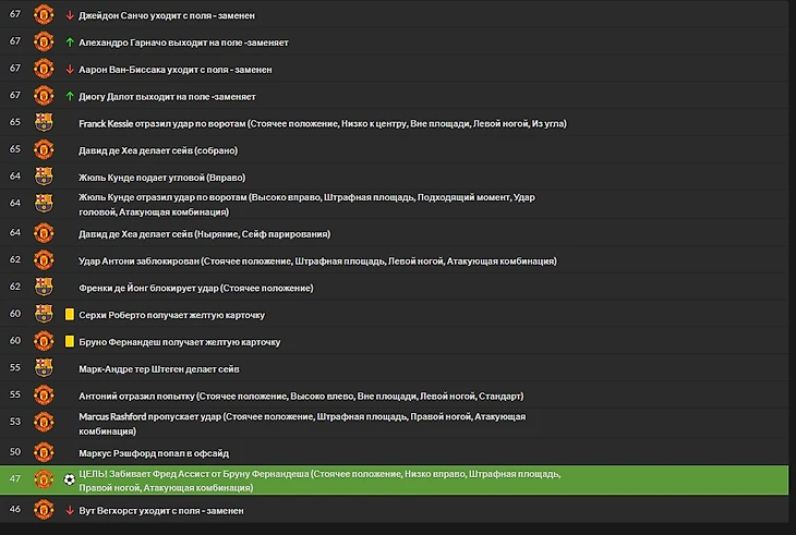 73 ГООООЛ!!! Антони, 2:1 Теперь уже затяжная атака манкунианцев с градом ударов приводит ко второму голу в ворота тер Стегена! Бруну Фернандеш на грани фола выцарапал мяч у Рафиньи и покатил на Гарначо слева в штрафной. Гарначо пробил, но попал в защитника. Мяч отлетел на Фреда, который тоже толком пробить не смог. Третья попытка была у Антони, который с правого края штрафной с левой пробил практически в левую "шестерку" под рукой падающего тер Стегена