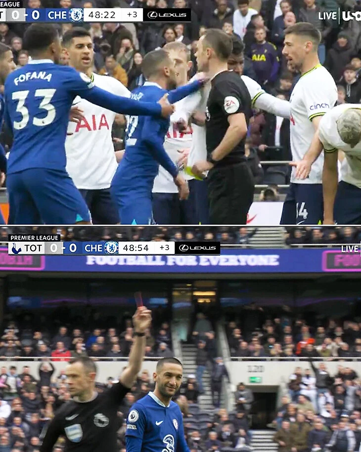 Пока «Челси» молчит в атаке (xG против «Тоттенхэма» – лишь 0,44), игроки атаки нарушают спокойствие не красивыми комбинациями, а стычками. Зиеш жестко полетел в Ришарлисона, началась потасовка, в ходе которой Хаким получил в спину толчок от защитника Эмерсона Рояла.