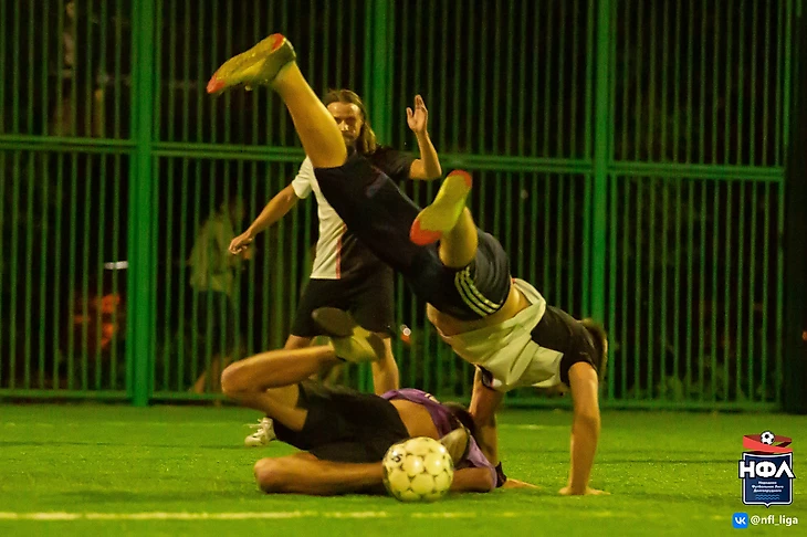 Эренцен Агинов (Север) валит Антона Разакова (Водник) в считанных сантиметрах ДО штрафной площадки. Через несколько секунд Разаков забьет гол прямым ударом.