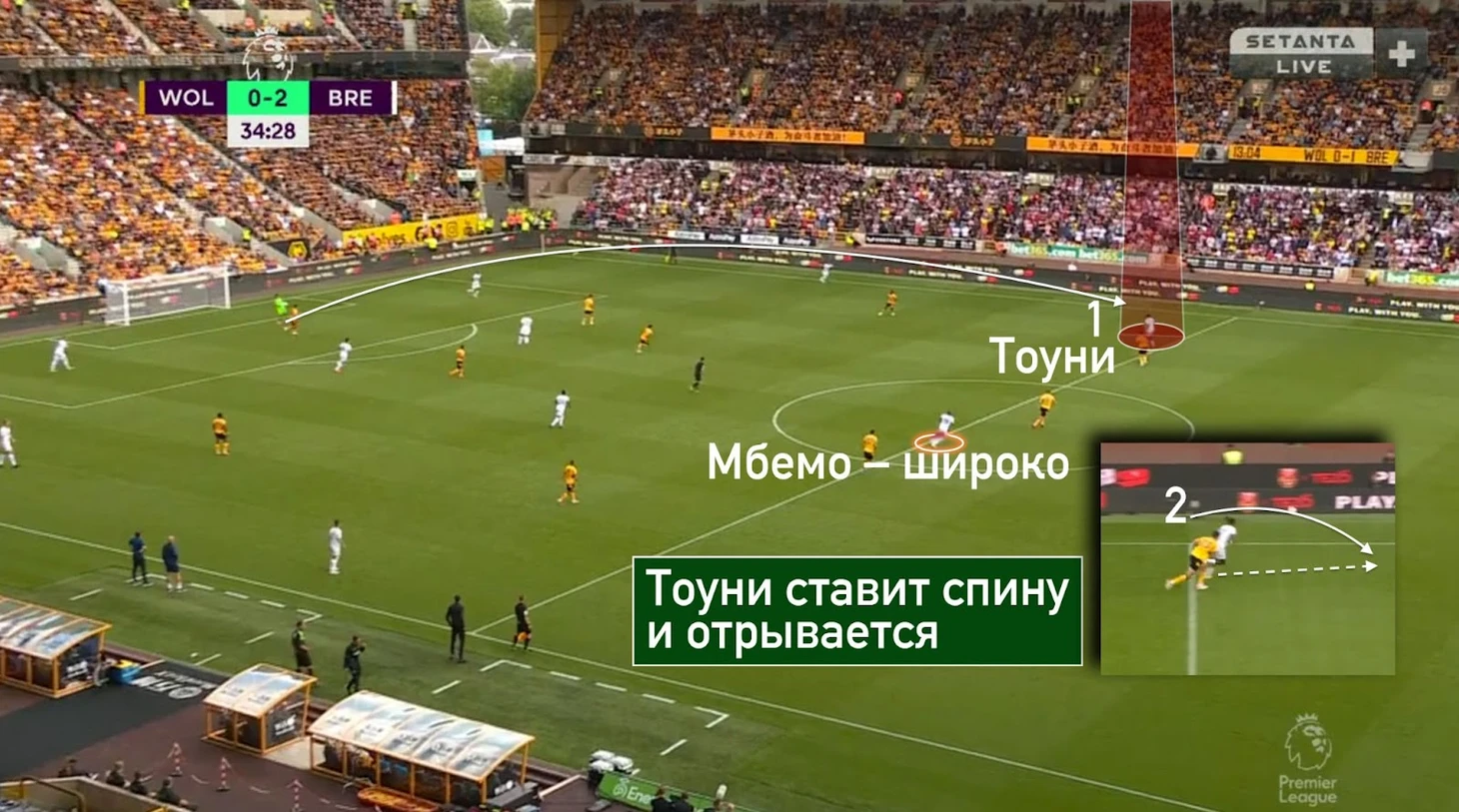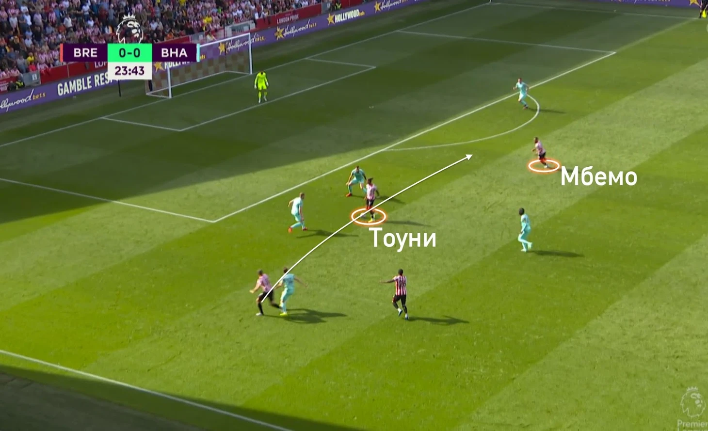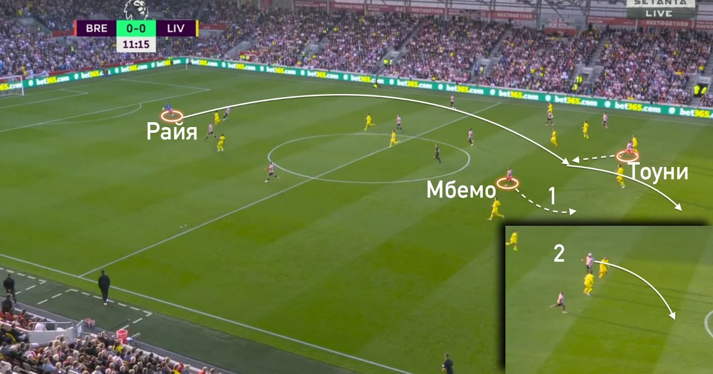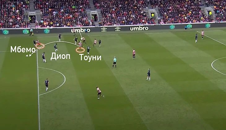 После отбора «Брентфорда» на чужой половине Мбемо уходит подальше от Тоуни, создавая ширину. Идет передача на Айвена, который до приема просканировал пространство справа от себя (повернул голову вправо, а Мбемо был слева) и пропустил мяч для Бриана, открывающегося в слепой зоне.