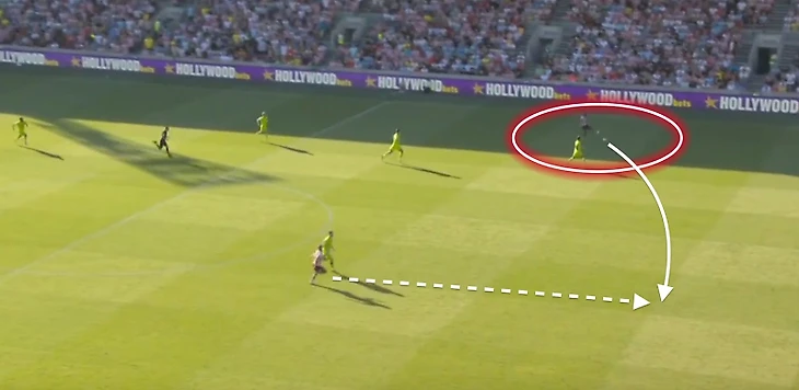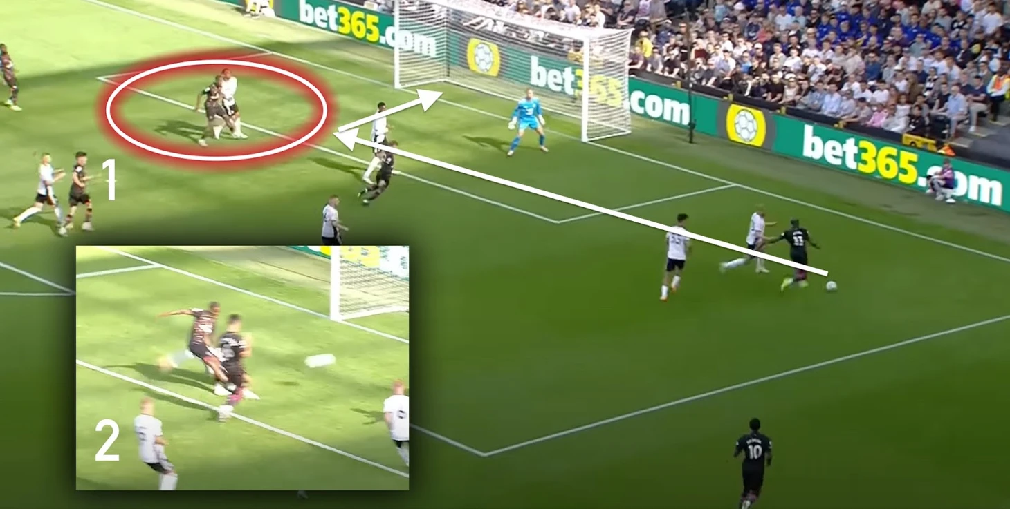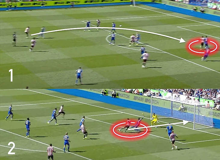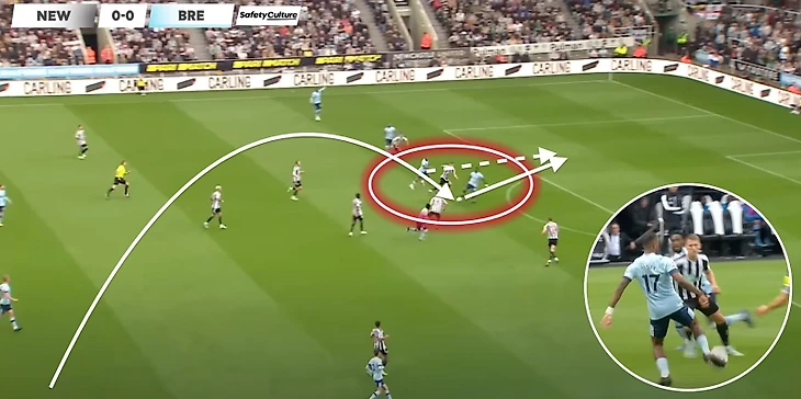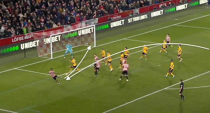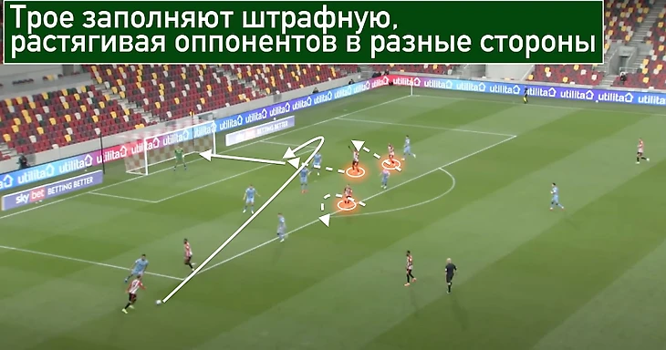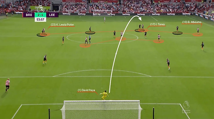 После отбора «Брентфорда» на чужой половине Мбемо уходит подальше от Тоуни, создавая ширину. Идет передача на Айвена, который до приема просканировал пространство справа от себя (повернул голову вправо, а Мбемо был слева) и пропустил мяч для Бриана, открывающегося в слепой зоне.
