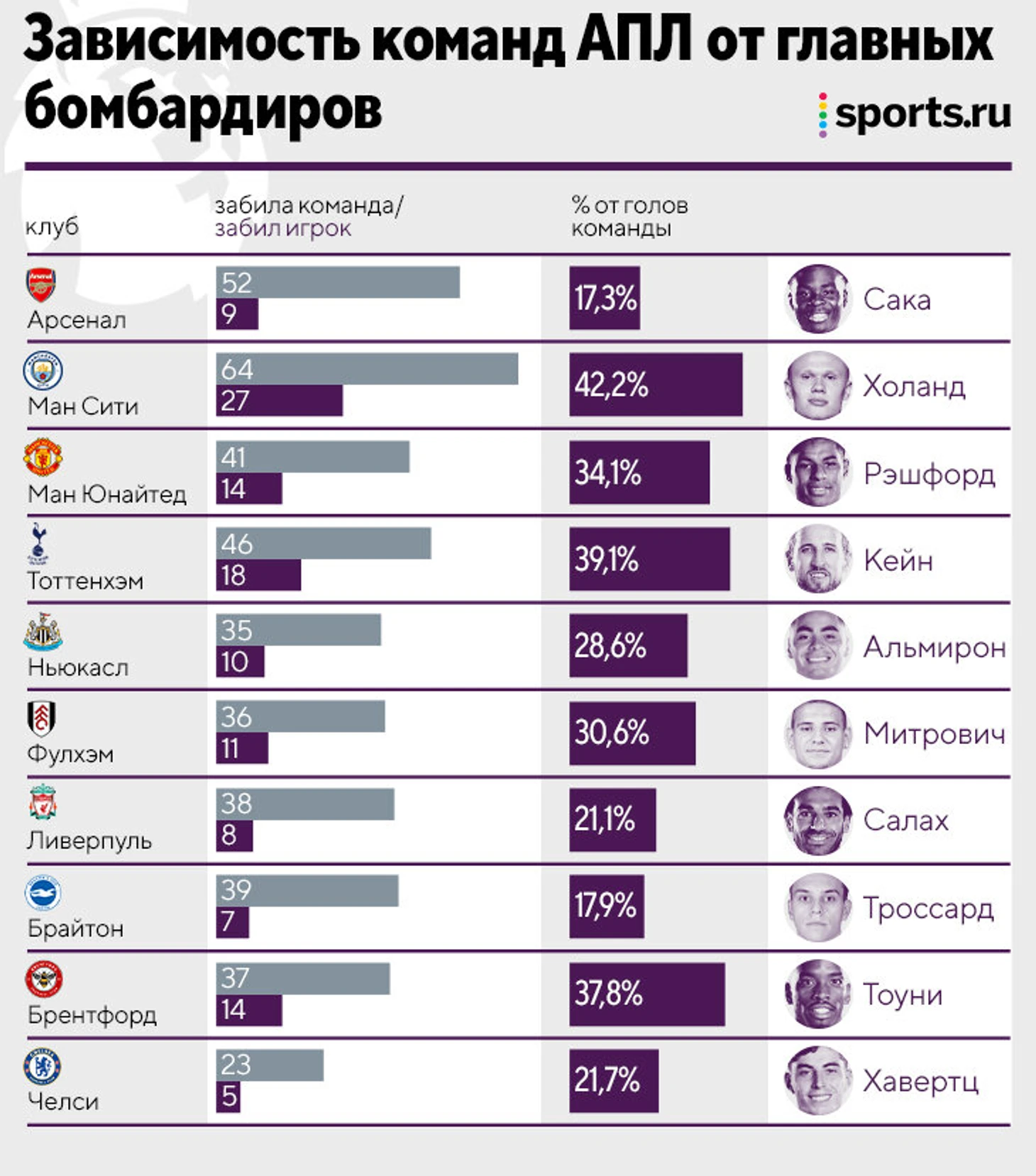 Забивает Айвен, конечно, не только с пенальти: за 54 матча в АПЛ у него 26 голов. За половину сезона-2022/23 настрелял уже больше (14), чем за прошлый (12). Если взять долю голов команды, забитых лучшим бомбардиром, Тоуни окажется на одном уровне с Холандом и Кейном.