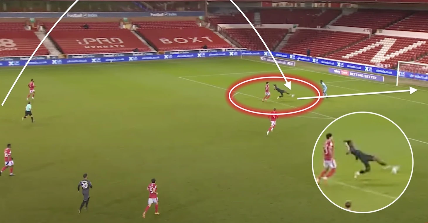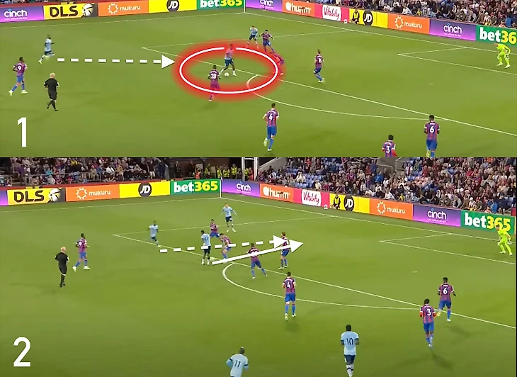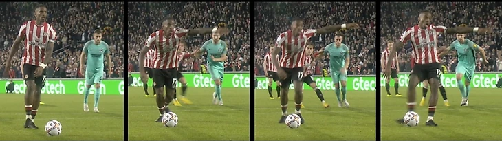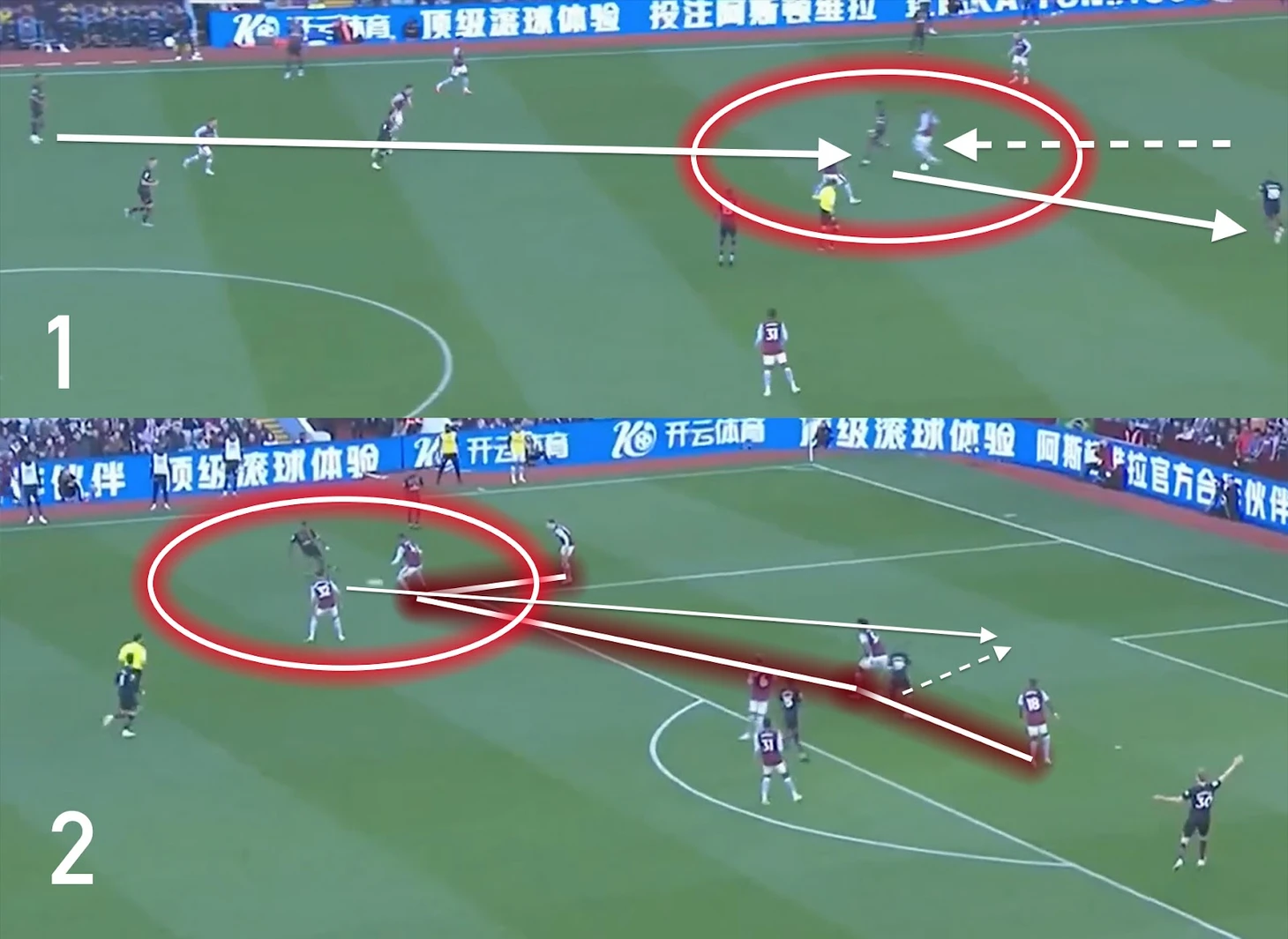 Здесь Мбемо и Тоуни в меньшинстве контратакуют «Юнайтед». Идет передача на Тоуни, но он пропускает мяч для улучшения позиции и одним касанием вырезает левой на Мбемо.