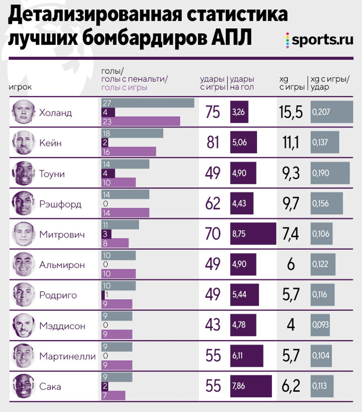 Возьмем топ-10 лучших бомбардиров АПЛ и увидим, что Айвену нужно меньше 5 ударов на гол. Среди форвардов (важно отметить, потому что вингеры чаще получают моменты с меньшим числом оппонентов) меньше попыток нужно только Холанду.