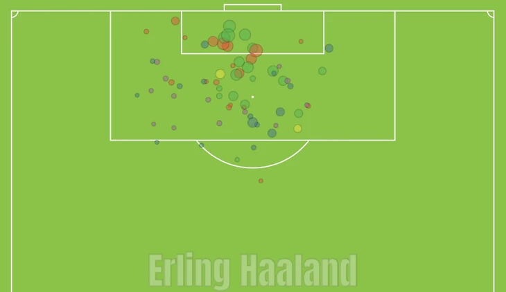 Холанд часто замыкает с близкой дистанции (2-6 метров от ворот), потому что моменты ему подают на блюдечке – это во многом заслуга Пепа. Причем бросается в глаза нескромное количество больших красных (ударов мимо ворот) кружочков. То есть Эрлинг нередко мажет из убойных позиций.