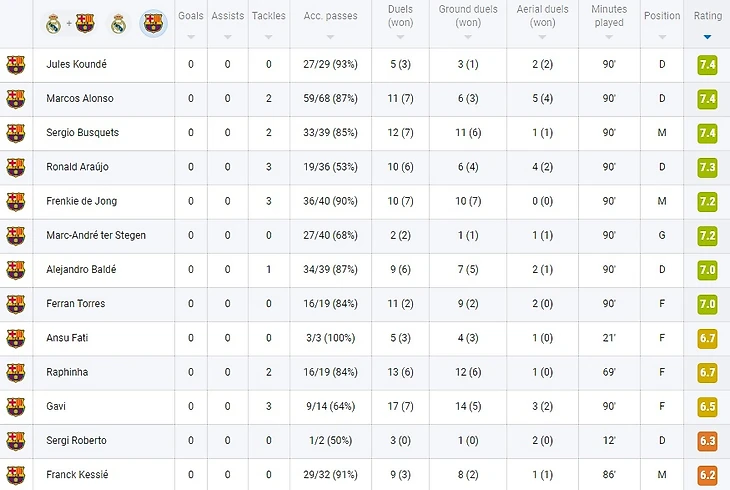 В итоге каталонцы не дали мадридцам сравнять счет благодаря усилиям Алонсо, Кунде и Араухо, за что защитники и получили высшие оценки по версии SofaScore, как и Бускетс, который упорно отбирал мяч у соперников.