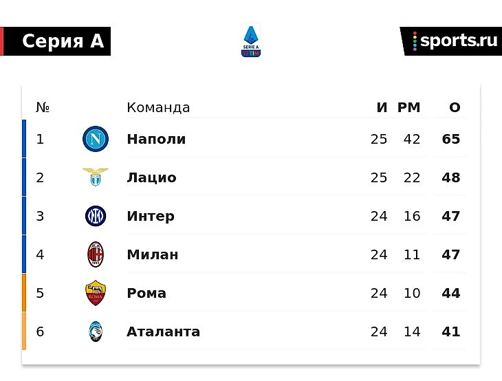 • «Лацио» забрался на второе место. «Наполи» держится на большом расстоянии от конкурентов – при худших раскладах отрыв может сократиться до 15 очков.