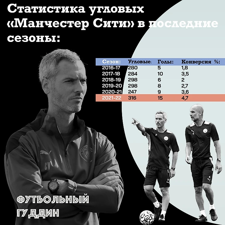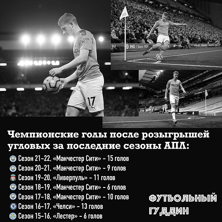 Чемпион последних лет «Сити» в прошлом сезоне забил 22 гола со стандартов без учета пенальти, 15 - пришлись на угловые и лишь единожды мяч закатился в ворота самих «горожан» (без учета пенальти).