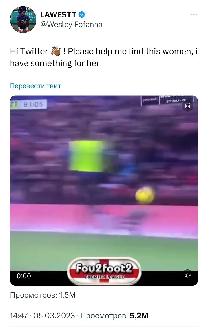 Вскоре после финального свистка Фофана выложил в твиттер пост, с помощью которого надеется найти свою «жертву». Говорит, что у него что-то для нее есть.