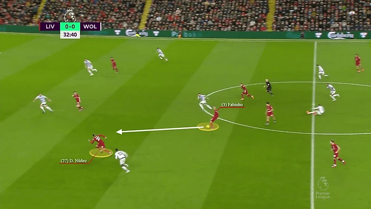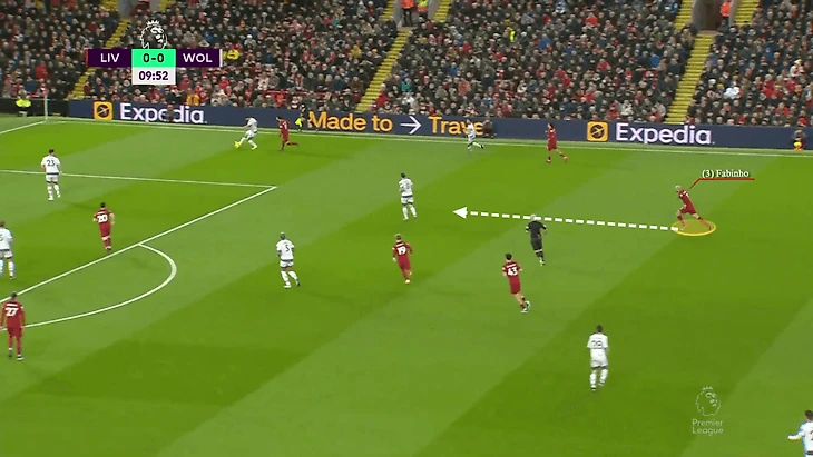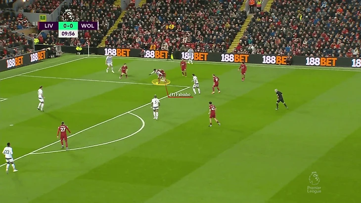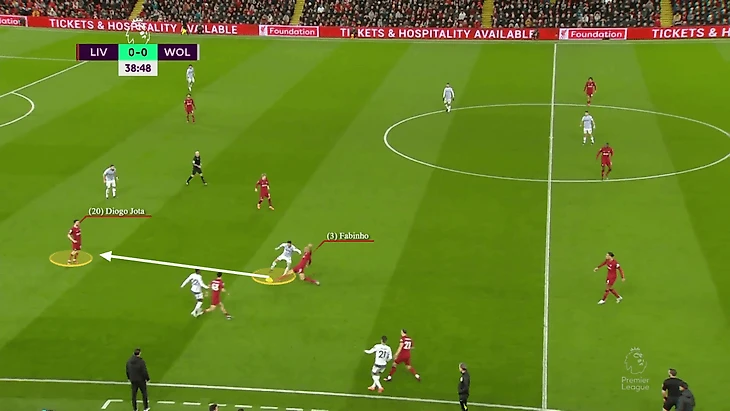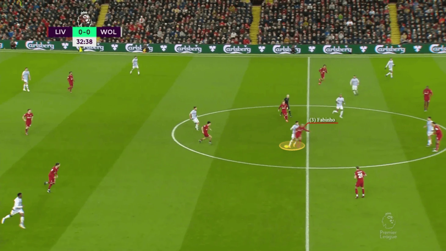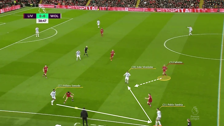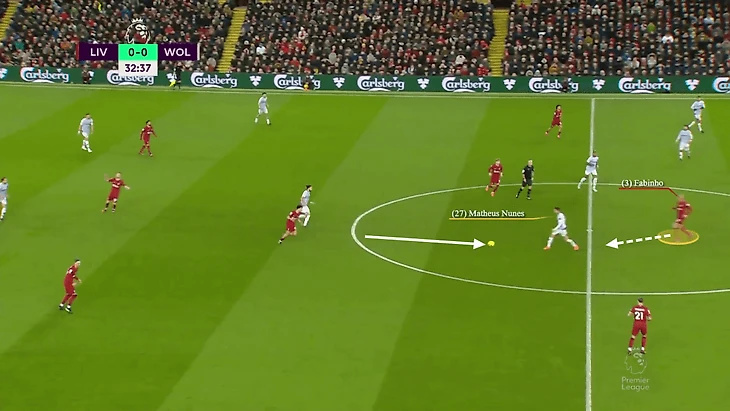 На 10-й минуте Фабиньо почувствовал возможность выиграть владение, когда Волки были загнаны на своей половине поля.