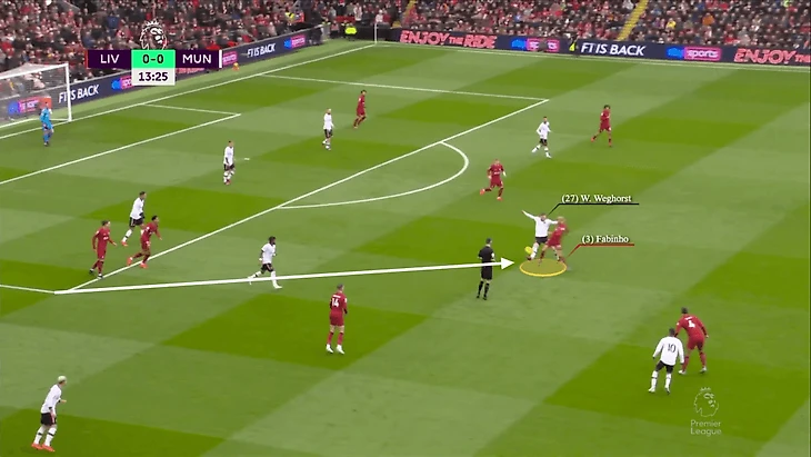 Когда «Манчестер Юнайтед» выводил мяч из защиты после остановки атаки «Ливерпуля», пас пошел на Вегхорста. Фабиньо прочитал ситуацию, чтобы вступив в единоборство с голландцем…