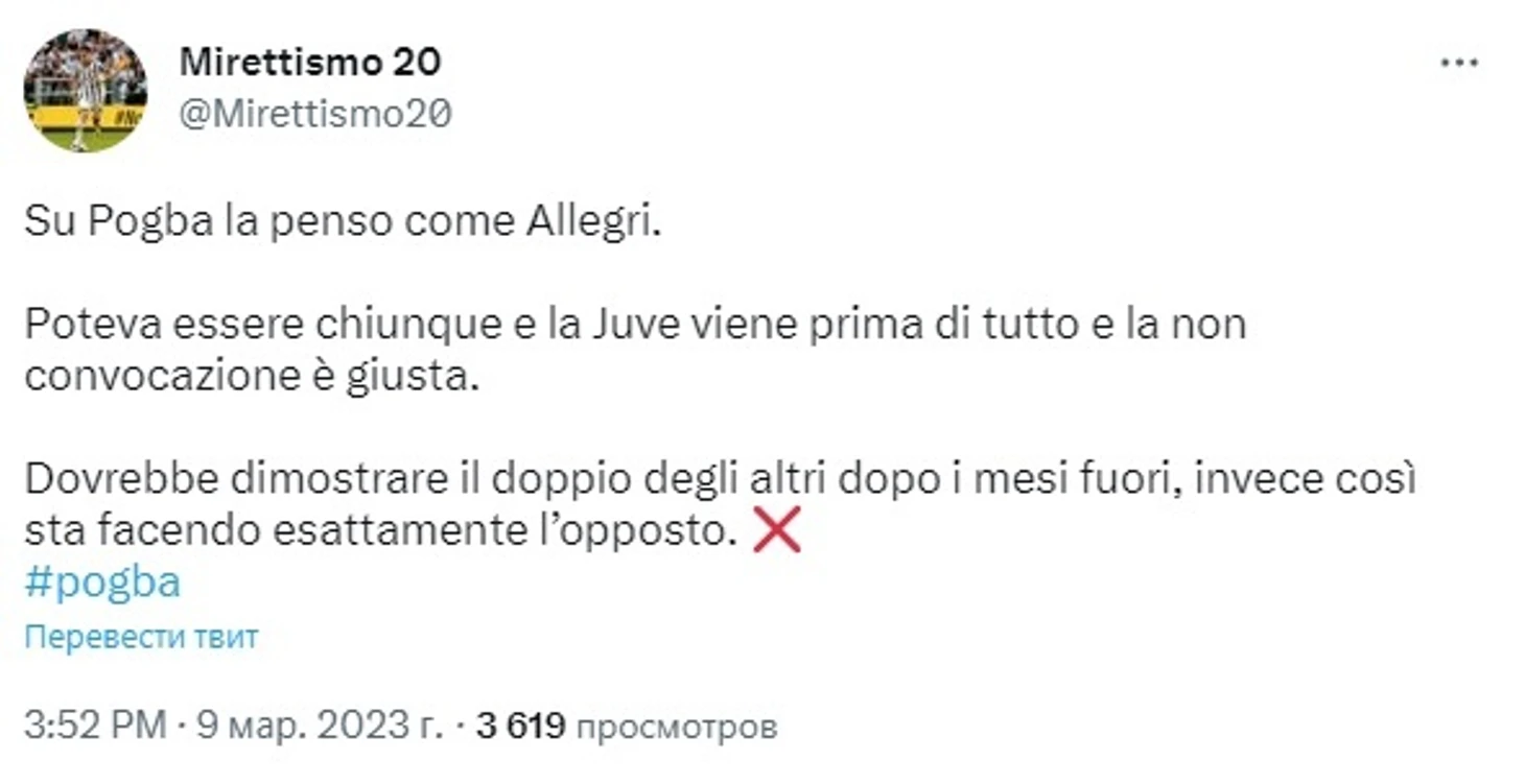 «О Погба я думаю, как и Аллегри. Не включать его в состав – правильное решение. Он должен был продемонстрировать в два раза больше, чем остальные после стольких месяцев вне игры, а он поступил с точностью до наоборот».