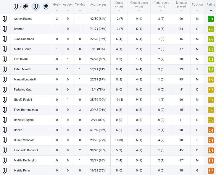 Лучший − Рабьо, худший − Влахович. Оценки игроков «Ювентуса» за игру против «Сампдории»
