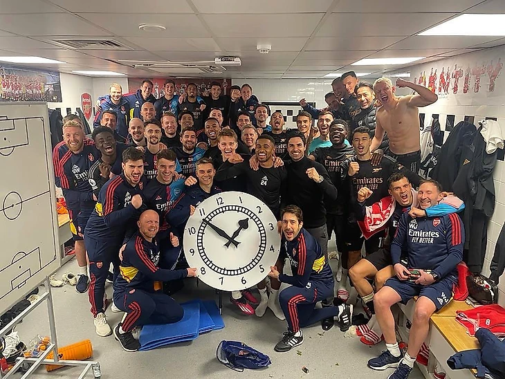 «Арсенал» разгромил в 27-м туре «Фулхэм», забив все три гола в первом тайме и укрепился на первом месте в пяти очках от «Ман Сити». В центре победного фото из раздевалки – часы. Фанаты разгадывают послание.