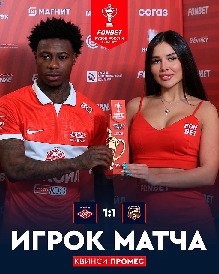 Полузащитник московского «Спартака» Квинси Промес признан лучшим игроком первого матча полуфинала Пути РПЛ ФОНБЕТ Кубка России с екатеринбургским «Уралом».